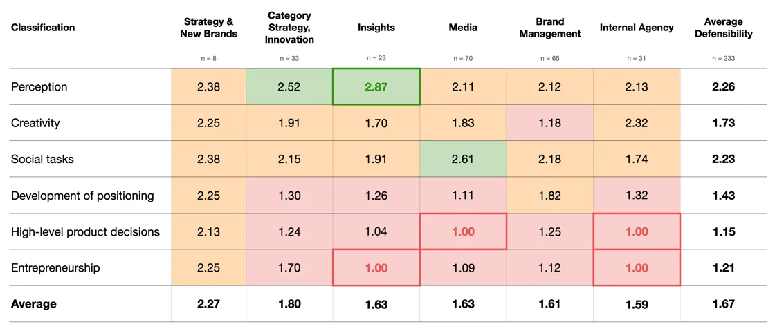 The more strategic, less brand-aligned functions scored the highest in terms of how defensible they are to being replaced by automation. The strategy and new brands functions had the largest concentration of highly defensible tasks. Brand management and category strategy and innovation also maintained a small but significant portion of highly defensible tasks.