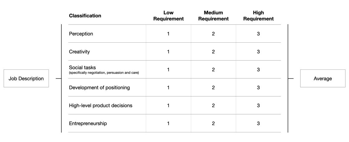 Not quite. We then classified the job descriptions according to the six functions that are difficult to automate, giving each a rating of 1 (low requirement), 2 (medium requirement) and 3 (high requirement).