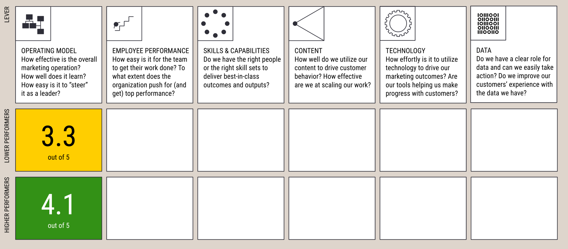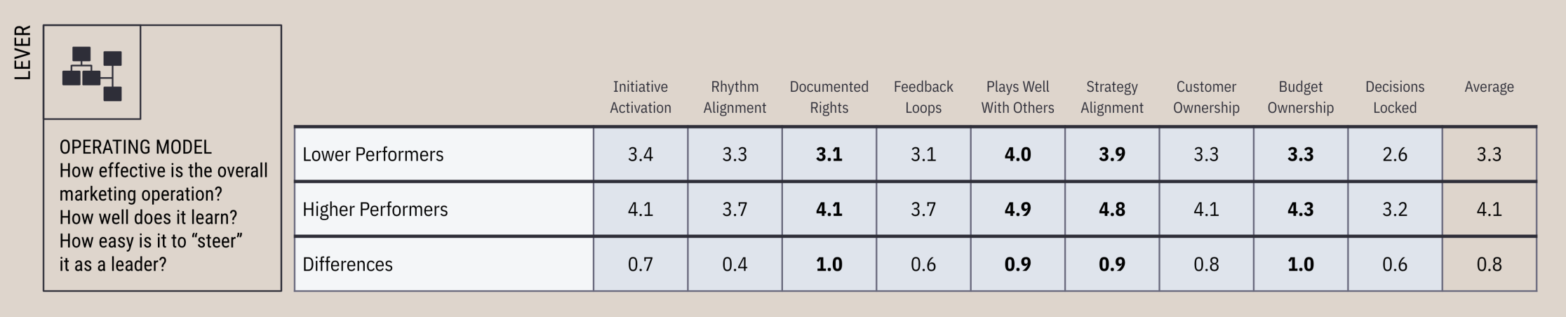 When we diagnose marketing teams in these areas – focusing only on their operating model for a moment – we find that the biggest differences between high-performing teams that successfully balance performance marketing and brand building diverge from lower performers in four key areas: