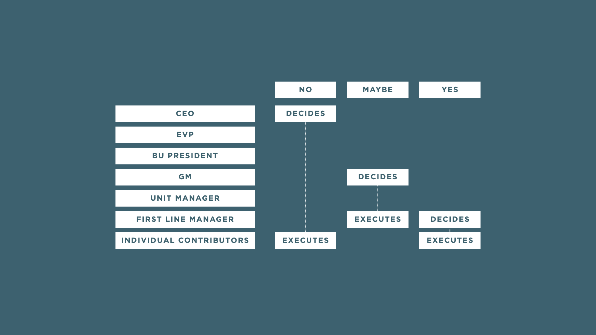 The fix: Flag this early. Describe the authority that would be needed – and any conditions to that authority – and go raise it directly with the person who already has the authority in question. Ask them for direct, written permission. If no one has explicit authority and everyone is just using soft power and influence to move things along, we should talk more.