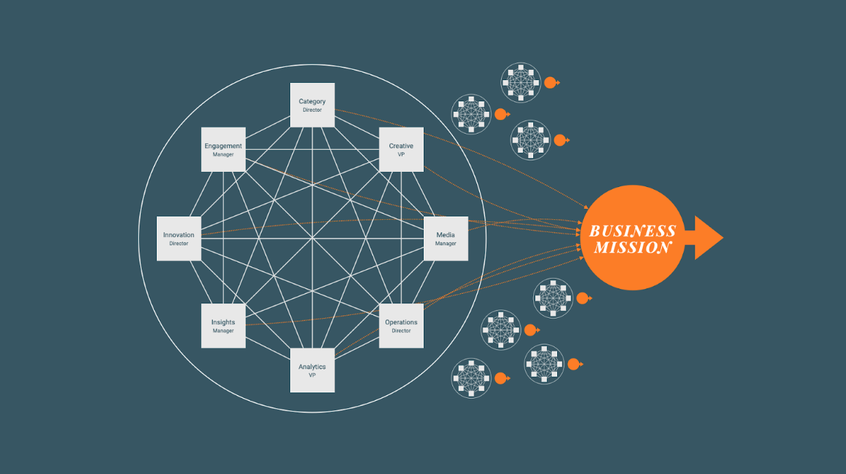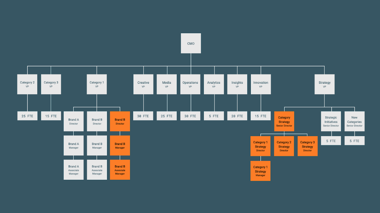 In this framework, teams are organized around capability areas, so that media, ops, analytics, insights, innovation and strategy units each contain a single capability. Their individual contributors and managers are usually aligned to the Categories/Brands on the left side of the chart. This creates all kinds of tension and conflict. Disagreements between Brand Director, Emerging Ice Creams and Strategy Director, Emerging Ice Creams usually can’t get resolved individually and need the Strategy VP and the Category VP to agree before work can start or resume.