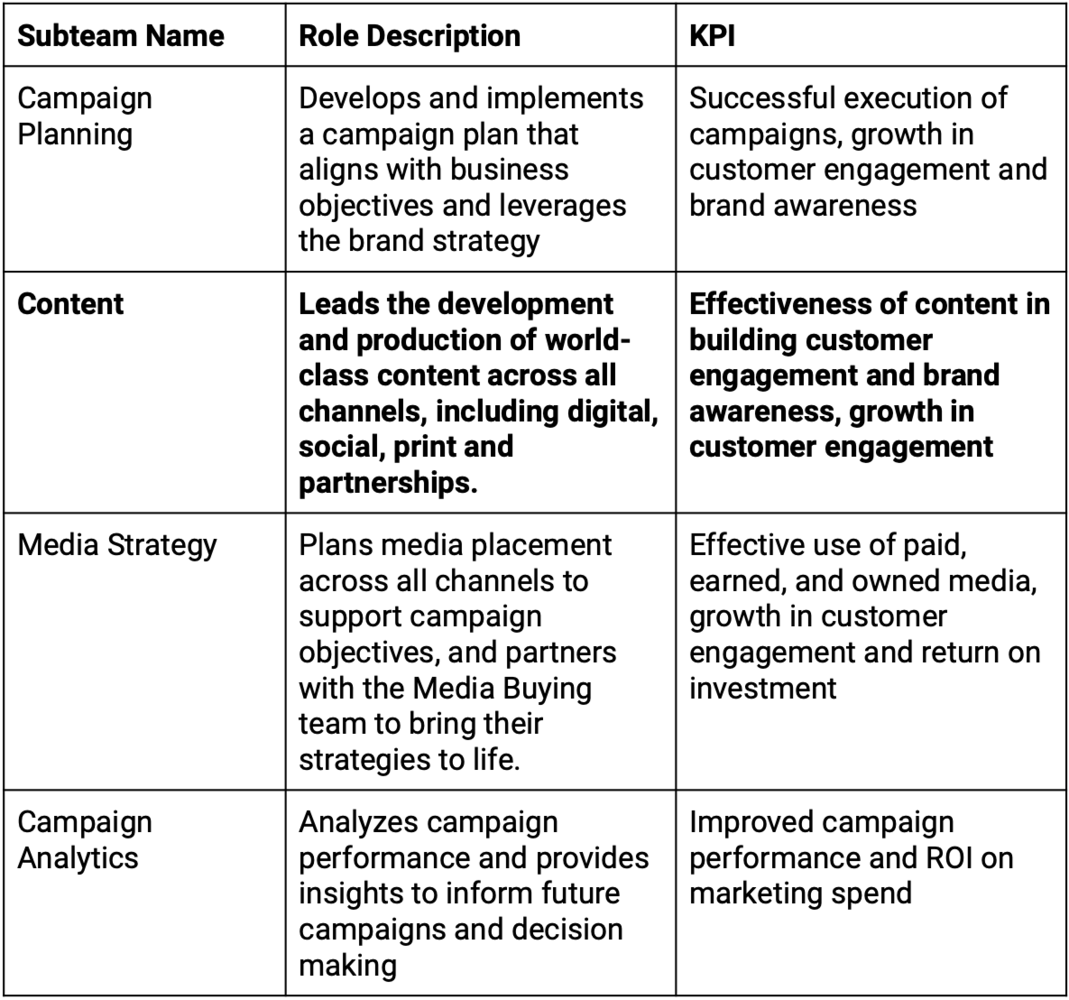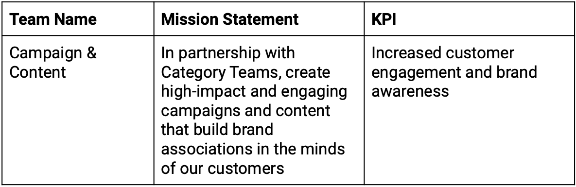 For this exercise, imagine you’re a CMO with 13 teams reporting into you: five different Category teams alongside eight functions, including Campaign & Content, Insights & Data Science, Innovation & New Product Development, Brand, eCommerce, Shopper/Retail, Marketing Technology, and Media Buying. Each of these should have a clear “team mission statement” that is assigned to the leader of the team. If you don't have clear mission statements for all those teams, now's a good time to write them down!