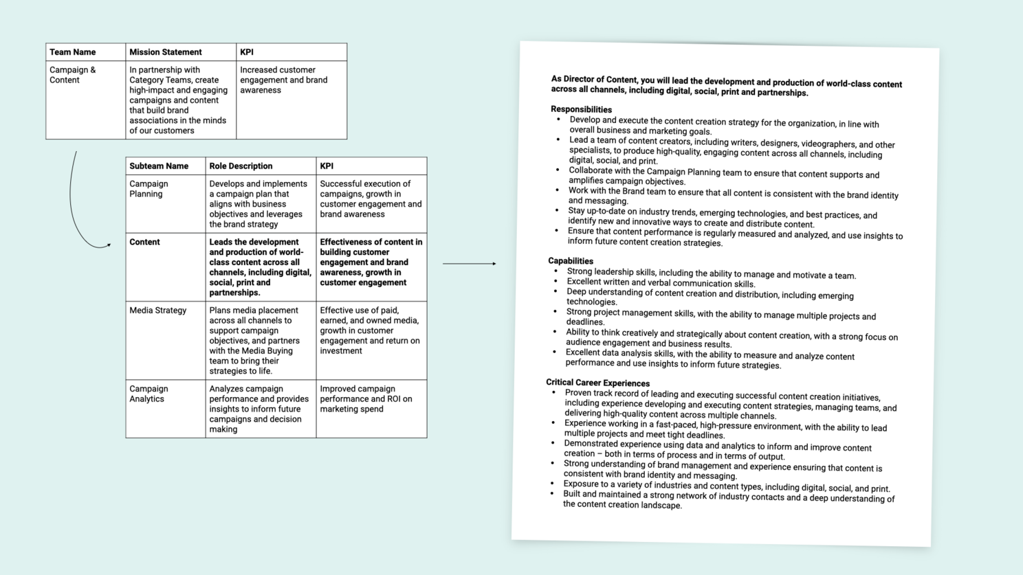 For a higher-level role like “Director”, we’re emphasizing more abstract responsibilities skills that are further from the tactical making of content. But most of these items can be made more abstract and leadership-y, or more specific and tactical – as a result, you can use this template to start to describe the responsibilities of the next level down, and so on.