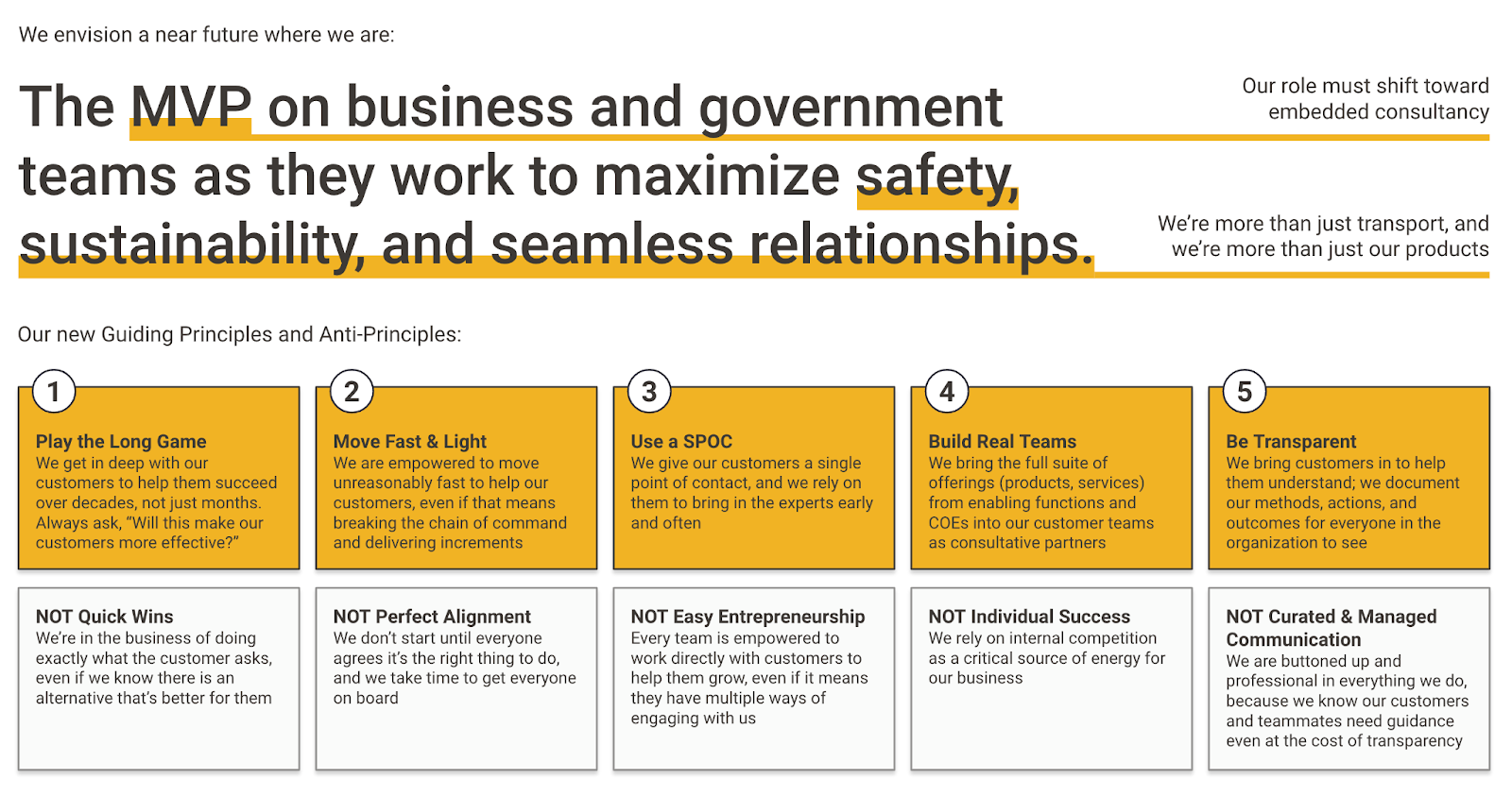 We worked the vision first, defining an aspiration that felt possible but also not necessarily true today. Next we went through rounds with the leadership team to define the principles. Something to note: we also introduced anti-principles (aka the polar opposite) for each of the agreed upon principle (hint: you SHOULD be able to articulate anti-principles easily). Writing them down helps you better define your principles by clearly calling out what they’re not. You can see examples in the image below.