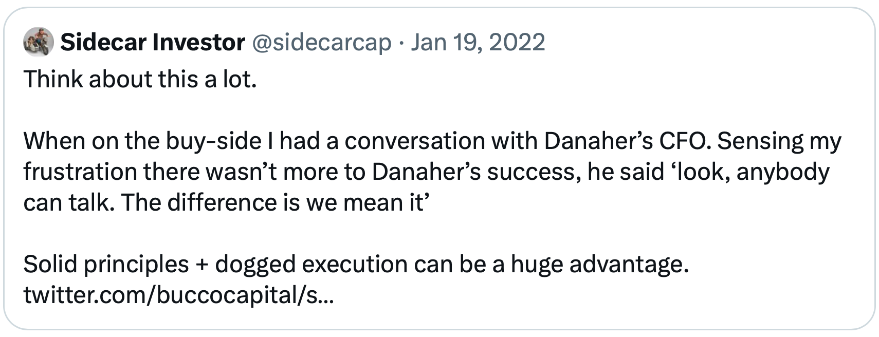 Danaher is a holdco/conglomerate focused on acquiring and improving companies in Life Sciences, Diagnostics, and Environmental Solutions. The DBS is their secret sauce. It’s a mindset and culture, and employees are rigorously trained in its nuances – which are always evolving and improving – so that they can bring the DBS to new acquisitions.
